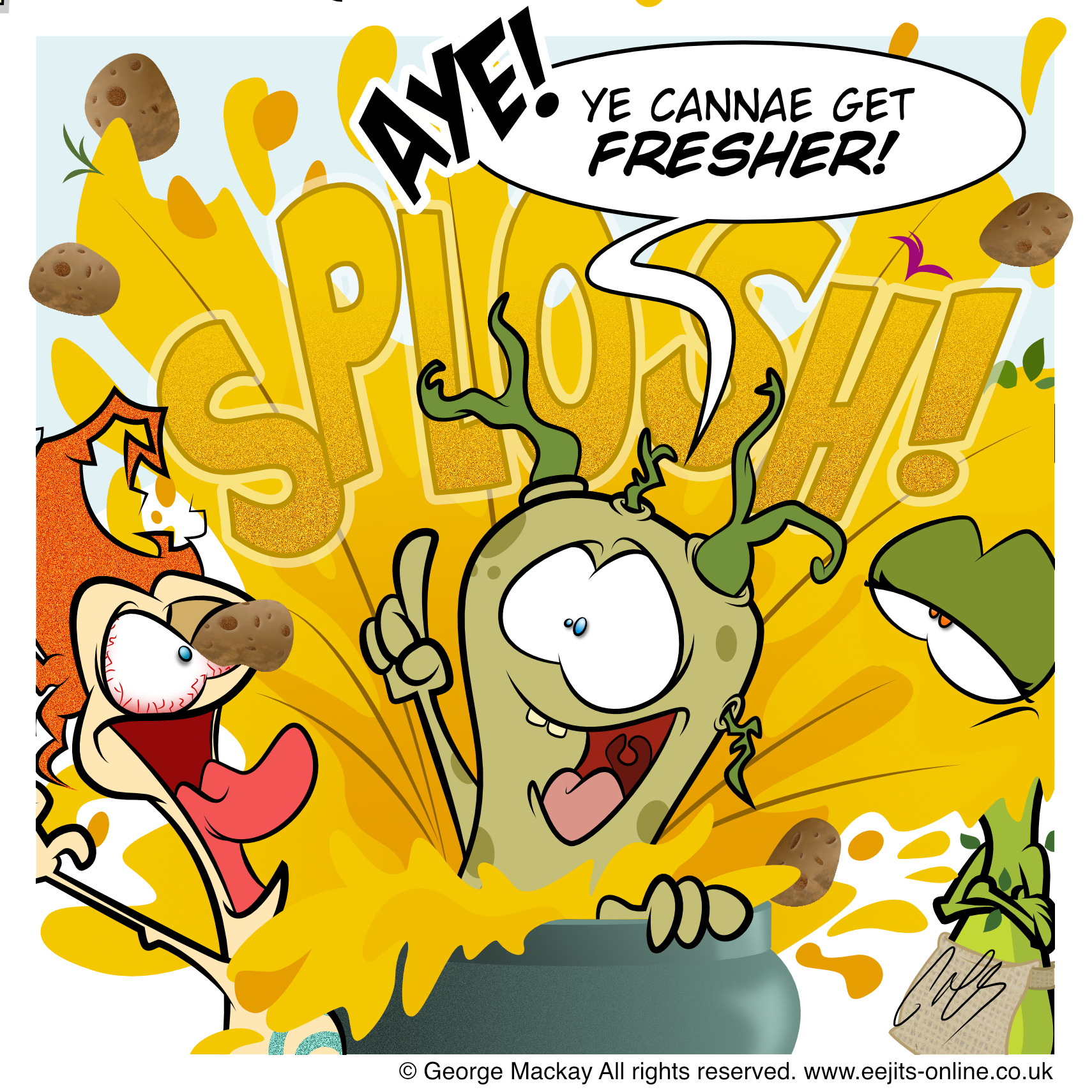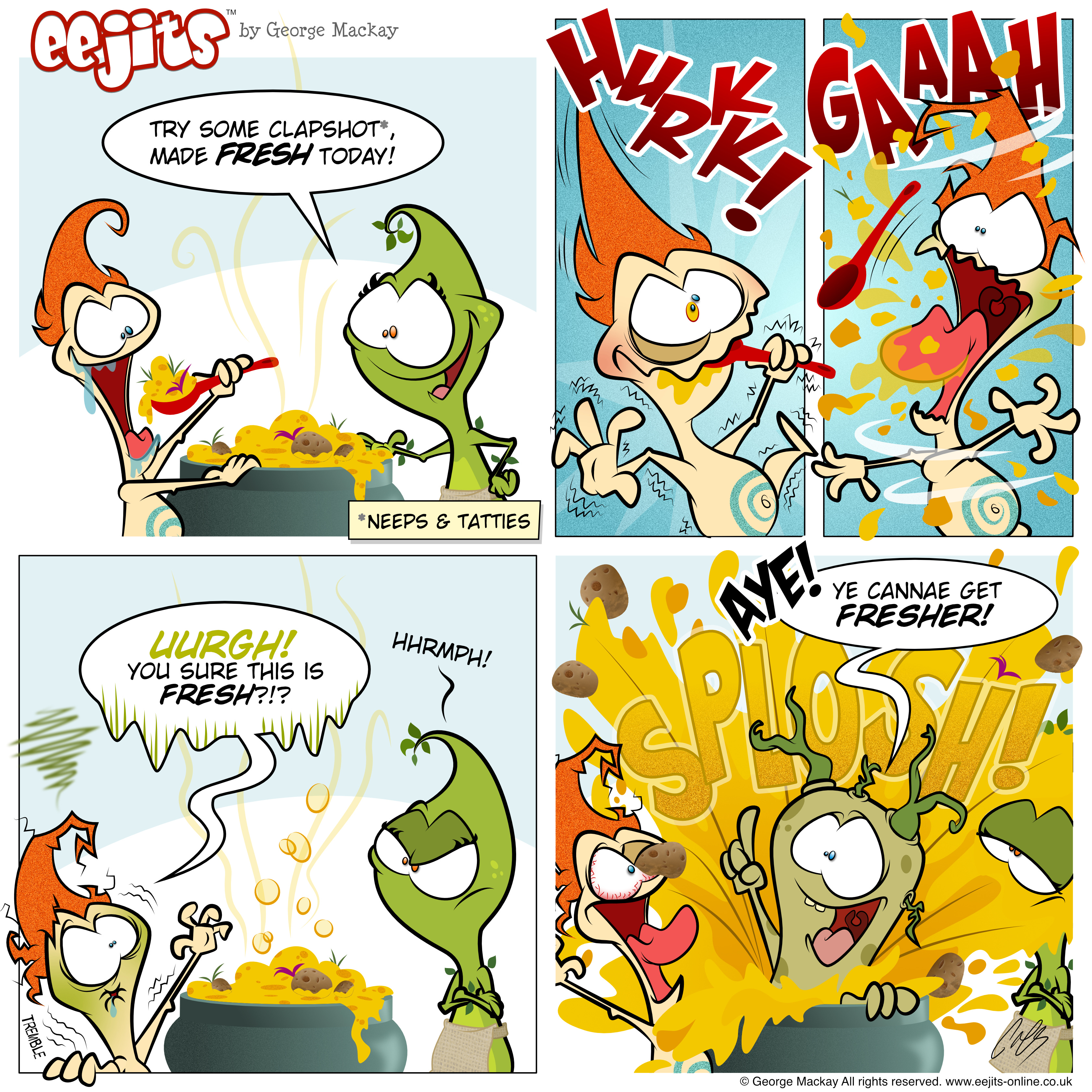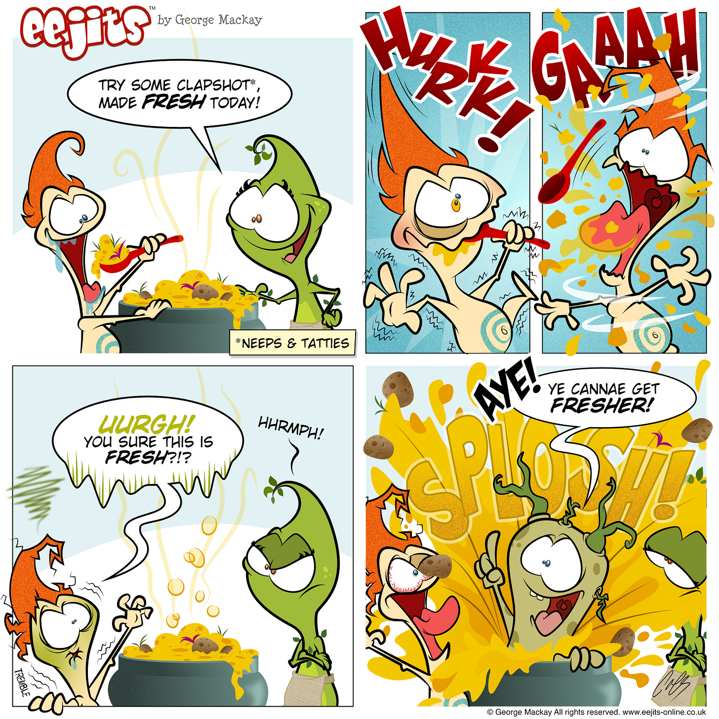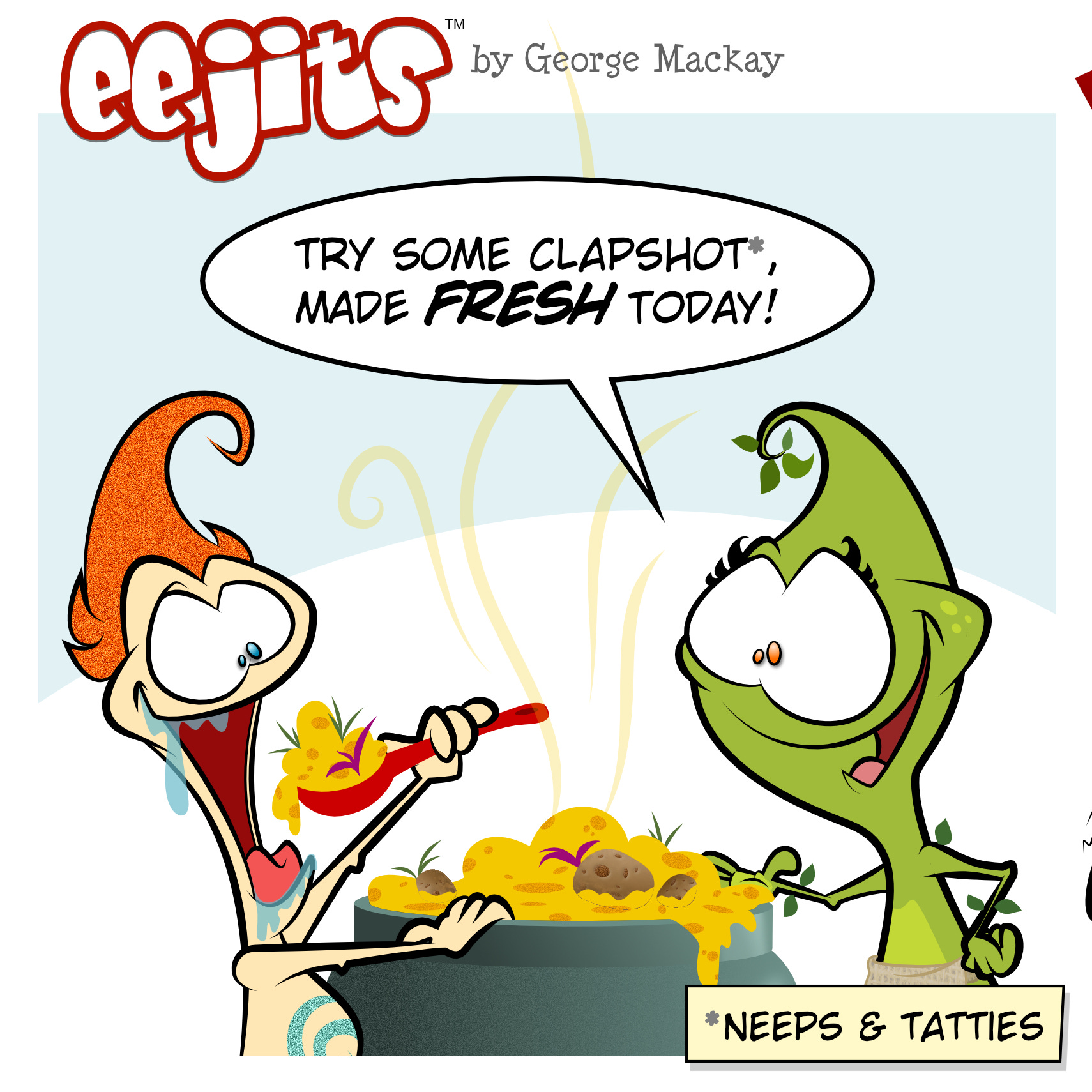 Aha! It’s time fer another new eejit CoMiC, this one is a culinary delight! Everybody loves Clapshot - the heady mix o’ mashed neeps and tatties. Enjoy the comic (and the transcript) and we’ll see ye soon for the next delicious installment o’ the HAiVERiNGS.